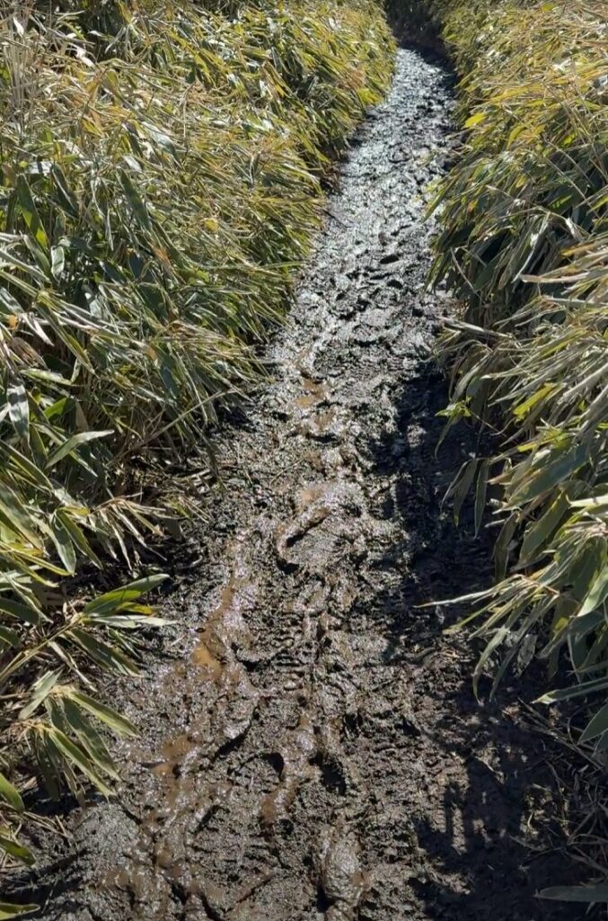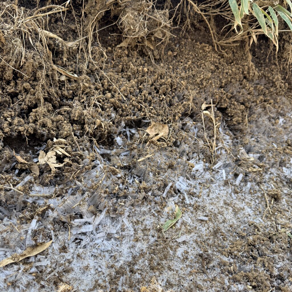 霜柱と泥の道:夜の間に凍った地面には霜柱がたくさん見られました。これが日中に溶け出すのか、地面は泥だらけで、ぬかるんでいました。