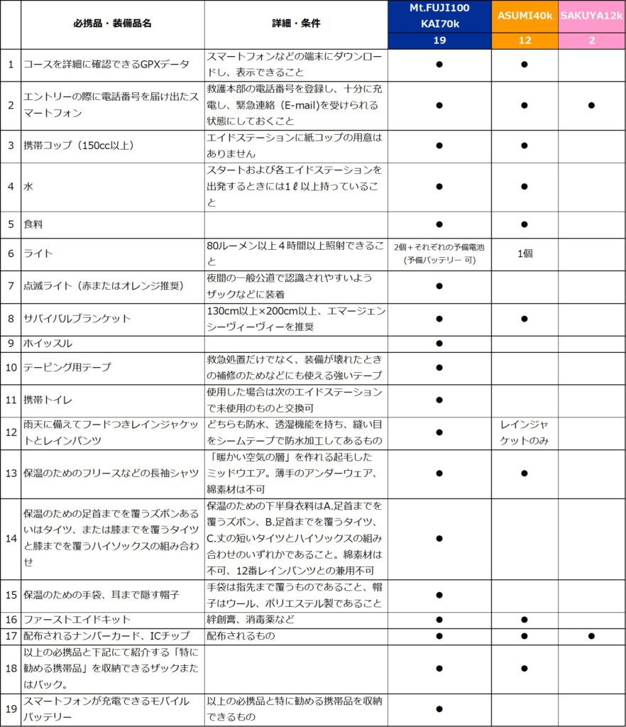 まず、Mt.FUJI100miで求められている必携品は下記のとおりです(2026年2月24日現在)。